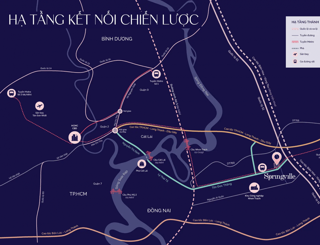 - Cầu Cát Lái (đang quy hoạch): Rút ngắn quãng đường từ Springville đến Q. 2, Q. 9 chỉ trong vài km.
